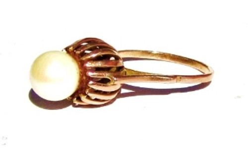 This unusual antique pearl ring is from our Estate Collection. The Pearl is 8.5 mm, creamy white in color, and lustrous. This 1920s natural pearl is set high on top of a rose gold grill surrounded.