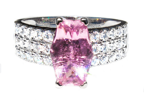 At its heart, a fancy-cut pink tourmaline takes center stage, boasting a captivating bubblegum pink hue that pops with vibrancy. Surrounding this exquisite gemstone are three rows of larger, colorless full-cut diamonds, each with 57 facets, adding dazzling brilliance to this eye-catching design.